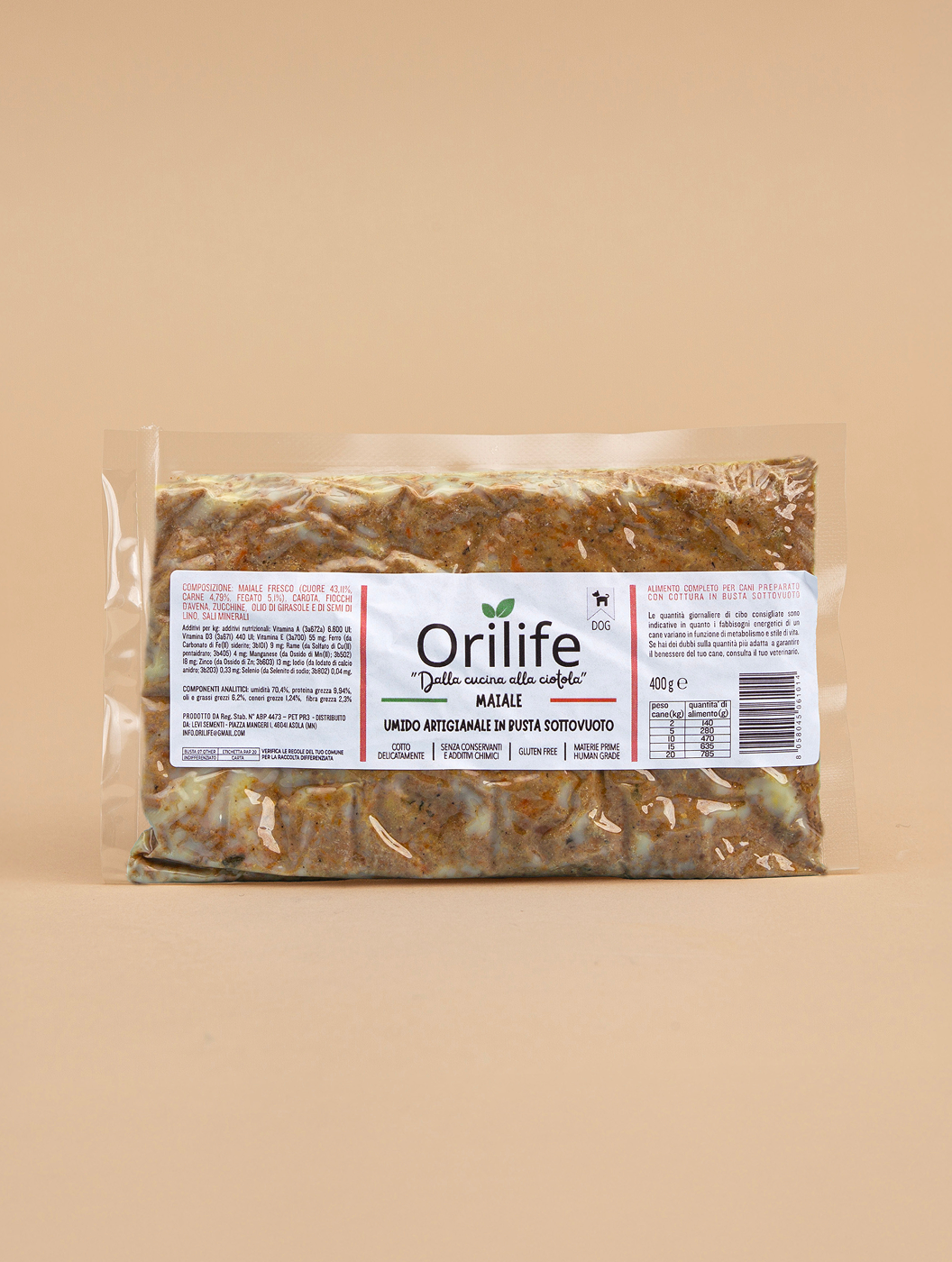 Pasto completo monoproteico a base di maiale human grade, cotto delicatamente in busta sottovuoto per preservare gusto e nutrienti. Naturale, altamente digeribile e ideale anche come alternativa alla dieta BARF, perfetto per l’alimentazione quotidiana o da portare in viaggio.