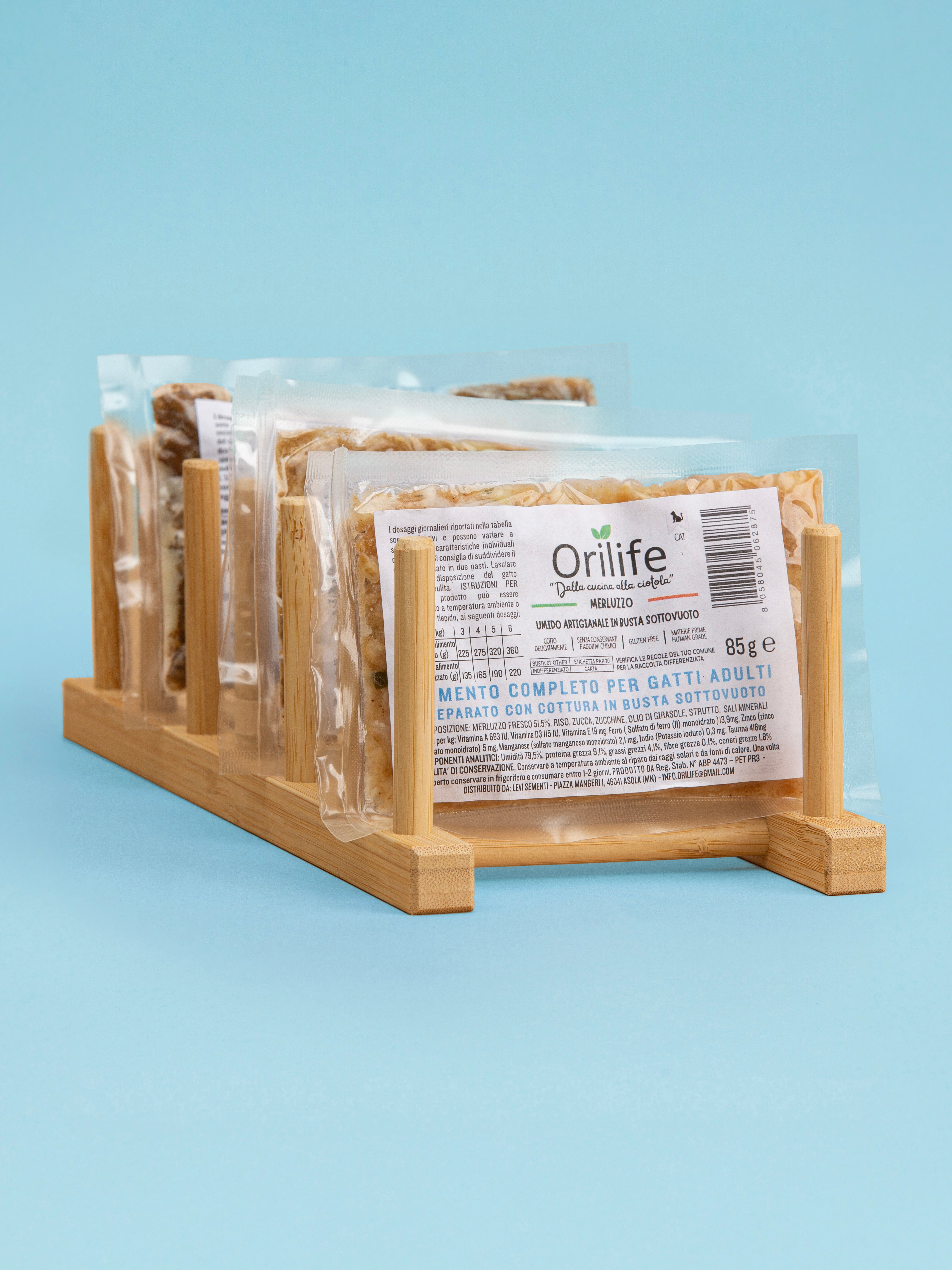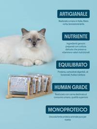 Pasto completo monoproteico a base di merluzzo fresco, arricchito con riso, zucca e zucchine, cotto delicatamente in busta sottovuoto per preservare gusto e nutrienti. Ideale per un’alimentazione leggera, sana ed equilibrata, anche come alternativa alla dieta BARF.