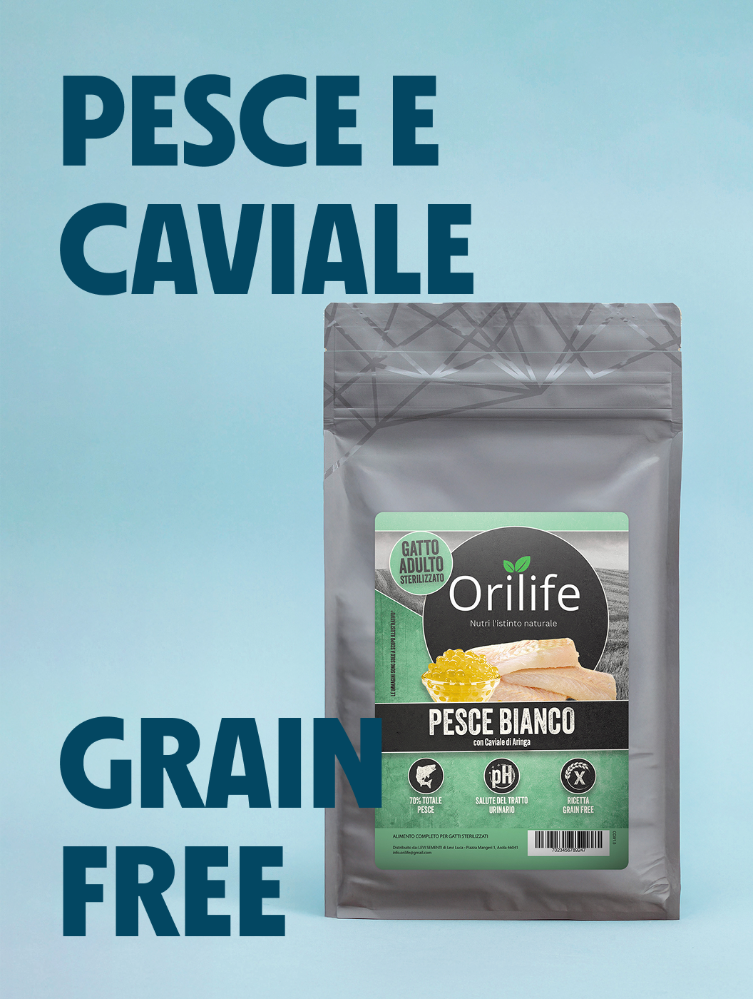 Crocchette grain free per gatti adulti sterilizzati, a base di pesce bianco e caviale di aringa, ideali anche per gatti da appartamento o anziani. Favoriscono il controllo del peso, la digestione sana e la salute del tratto urinario, con ingredienti funzionali come L-Carnitina, olio di salmone e prebiotici.
