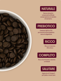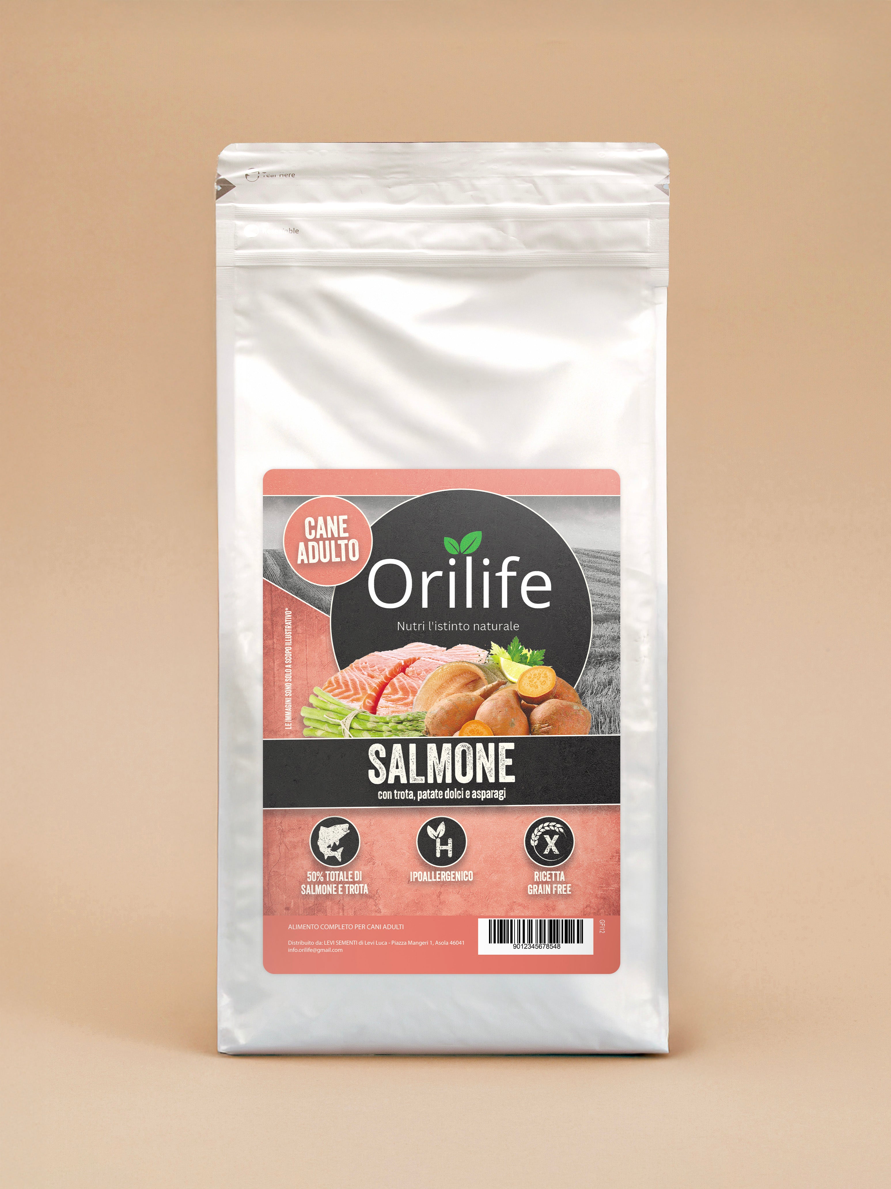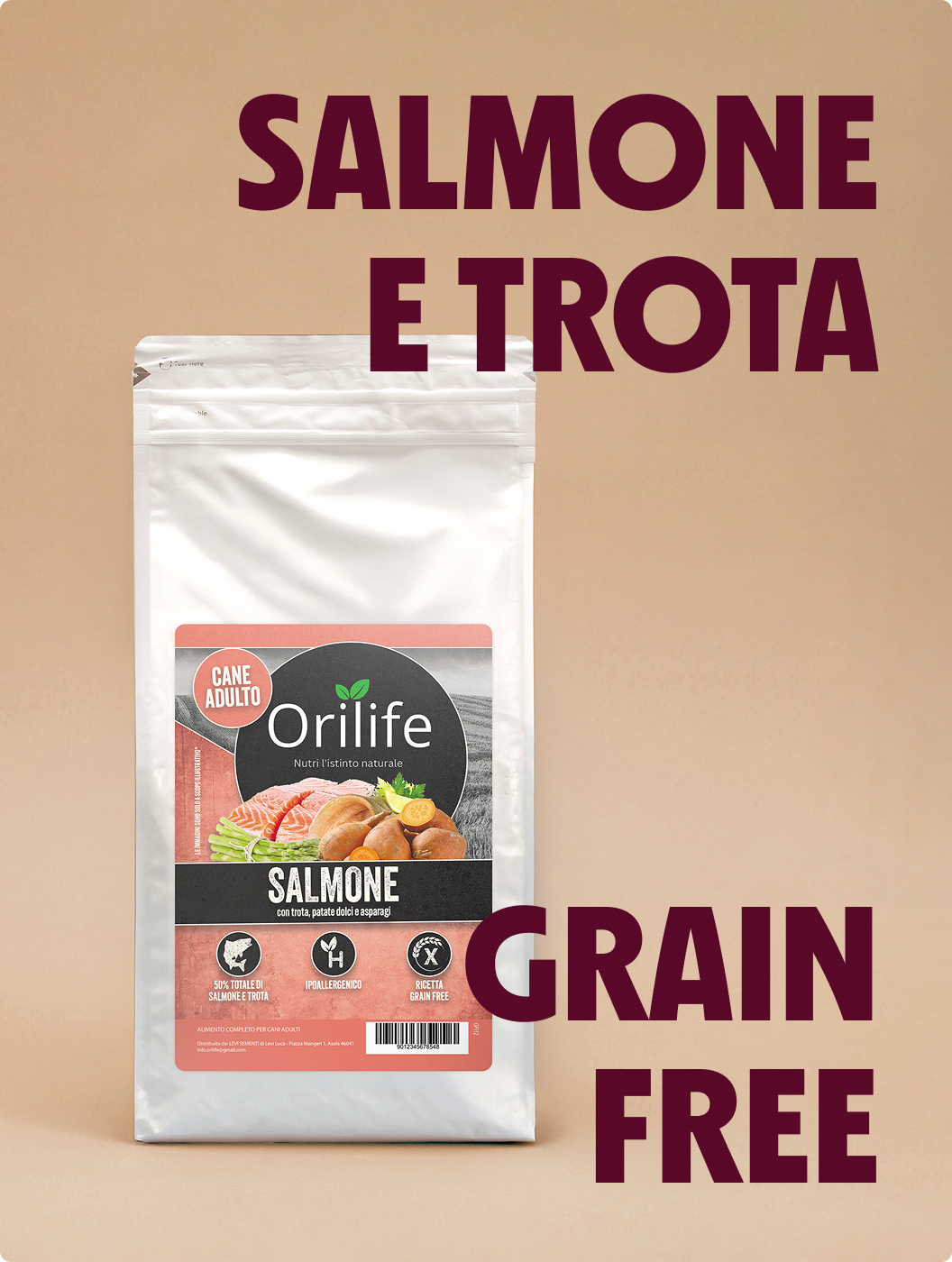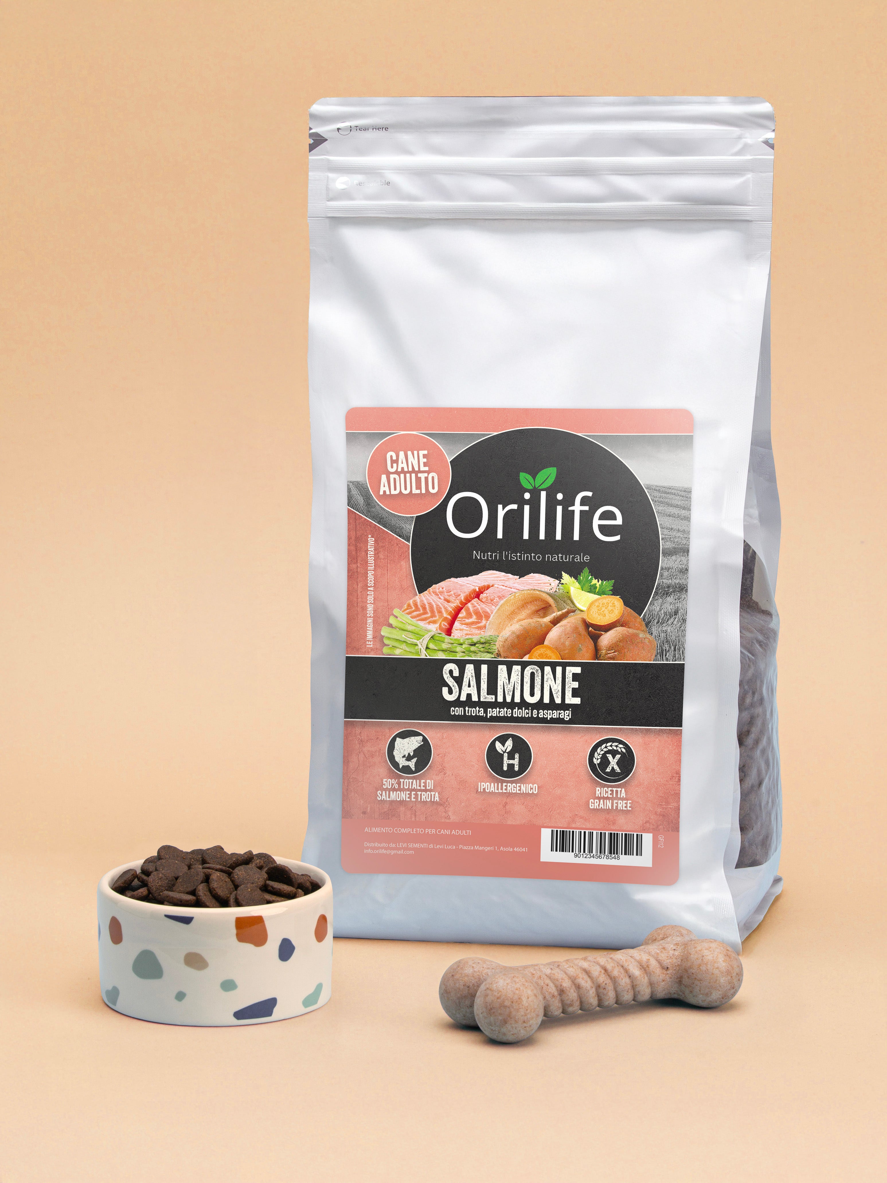 Crocchette Grain Free per cani adulti con salmone e trota, patate dolci e asparagi. Una ricetta naturale ricca di Omega 3, vitamine e prebiotici per favorire digestione, cute e manto sani.