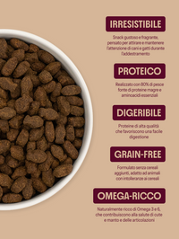 Una ricetta a base di pesce di alta qualità, con salmone, trota e pesce bianco, naturalmente ricchi di acidi grassi essenziali Omega-3 dalle proprietà antinfiammatorie. Questi nutrienti contribuiscono a mantenere cute sana, manto lucido e articolazioni forti, mentre le proteine e le vitamine del gruppo B (B6, B12, niacina) supportano la vitalità e il benessere generale del tuo pet.